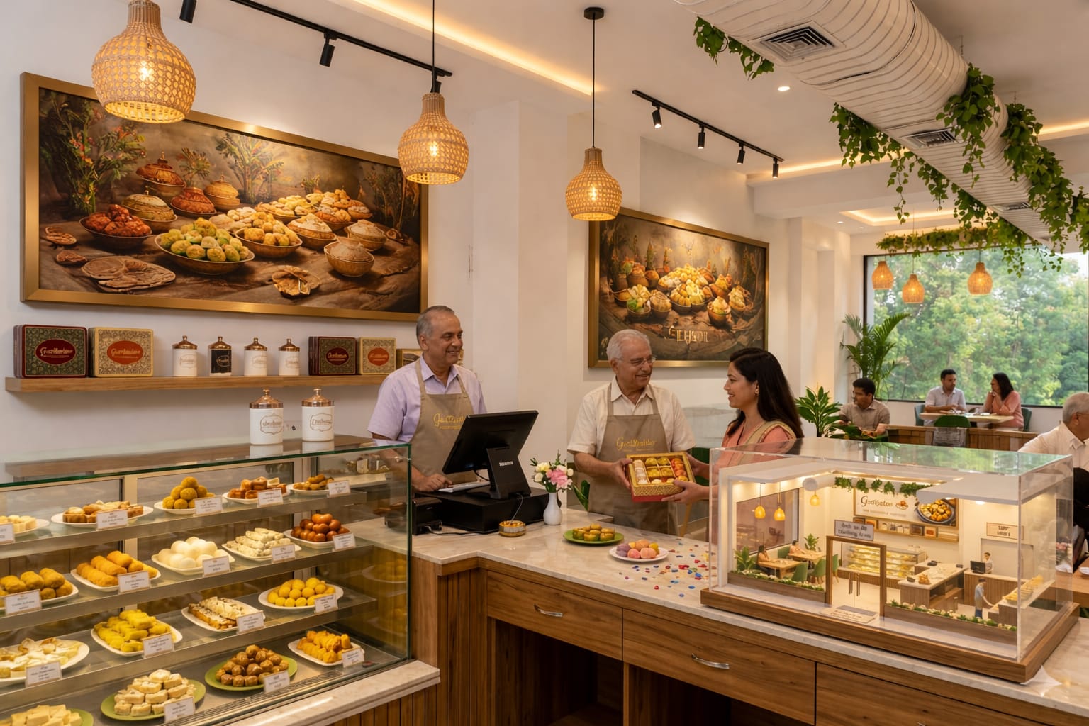 At Guड़ शक्kar – Sweet Bites, tradition meets refinement in a space designed for indulgence and comfort. Rooted in the richness of Indian culinary heritage, our offerings celebrate timeless flavors crafted with precision and passion. From handcrafted mithai to thoughtfully curated dining experiences, every detail reflects a harmony of authenticity and modern elegance. Surrounded by marble textures, warm ambient lighting, and lush green accents, our restaurant is more than a place to dine — it is a place to pause, connect, and savor. We bring together the nostalgia of Indian sweets and the sophistication of contemporary hospitality to create a truly memorable experience.